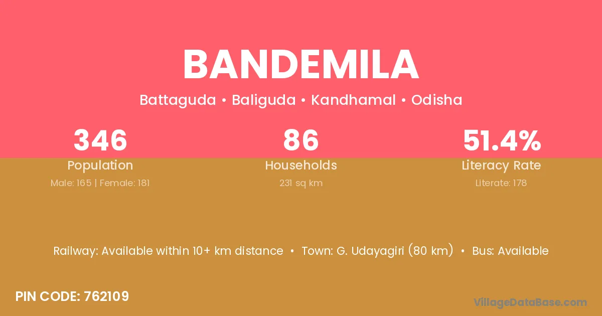 G. Udayagiri (80 km) is the nearest town to Bandemila village for major economic activities and is located approximately 80 km away.