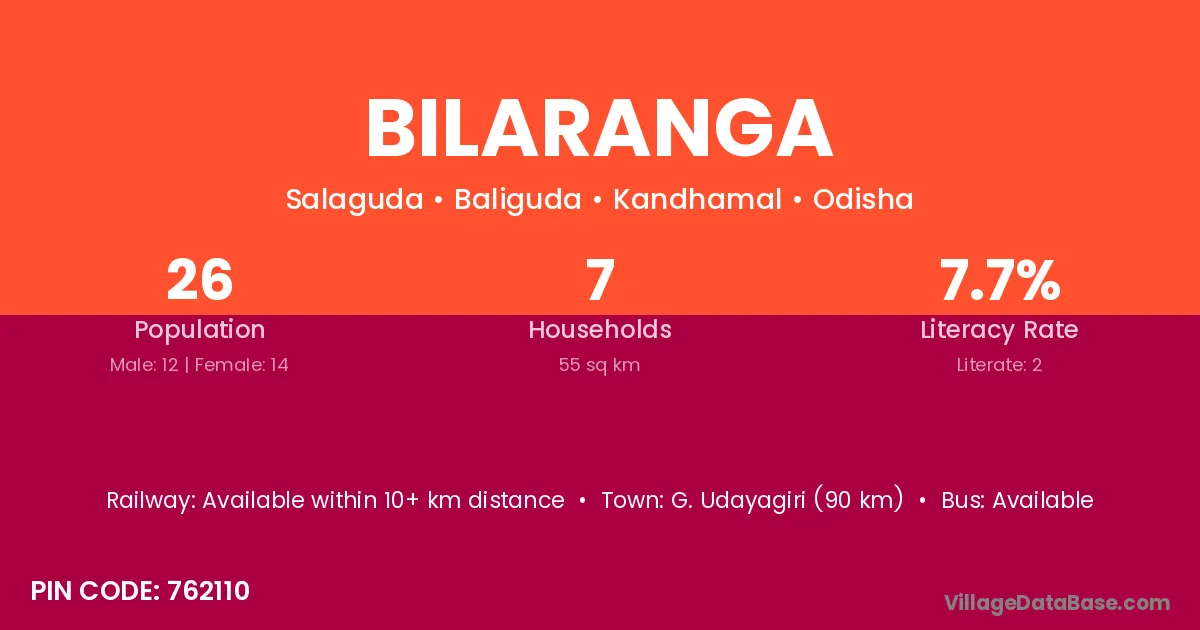 Bilaranga village has a total population of 26 people, of which 12 are males and 14 are females.