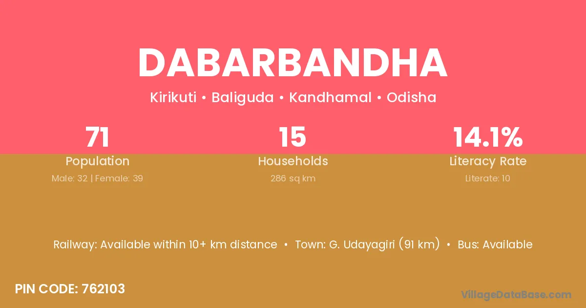 G. Udayagiri (91 km) is the nearest town to Dabarbandha village for major economic activities and is located approximately 91 km away.