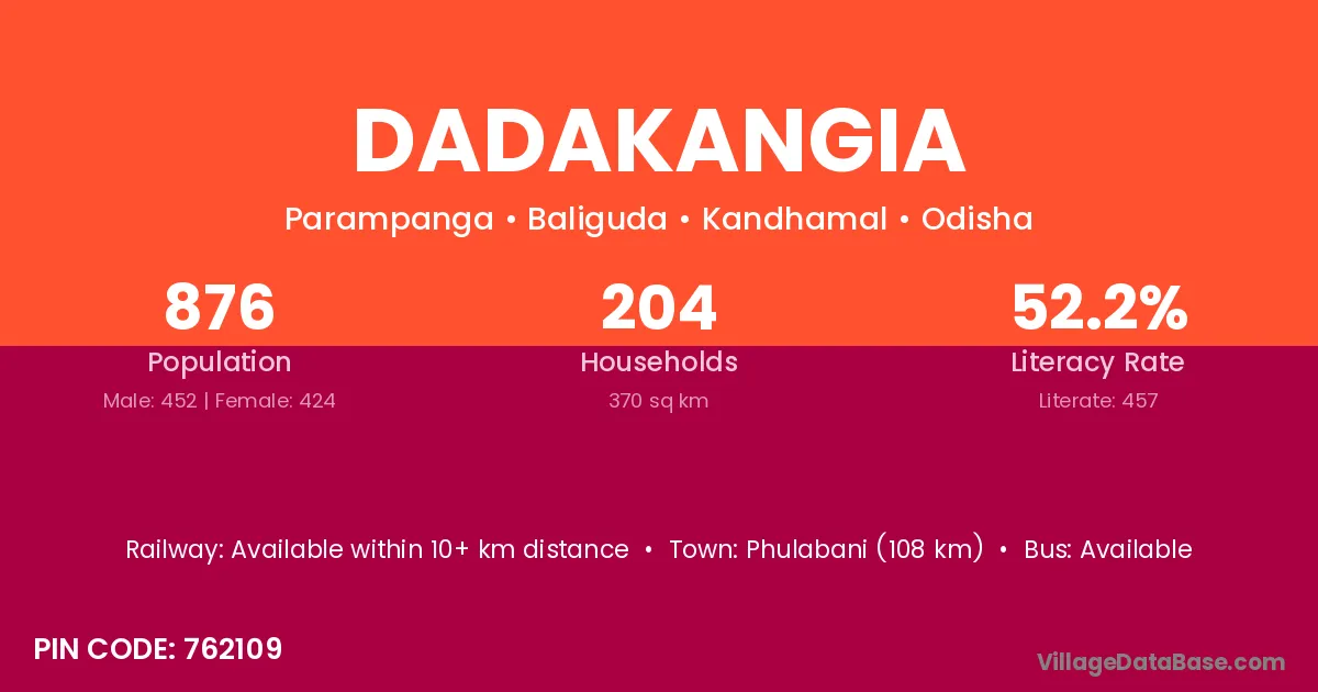 Phulabani (108 km) is the nearest town to Dadakangia village for major economic activities and is located approximately 108 km away.