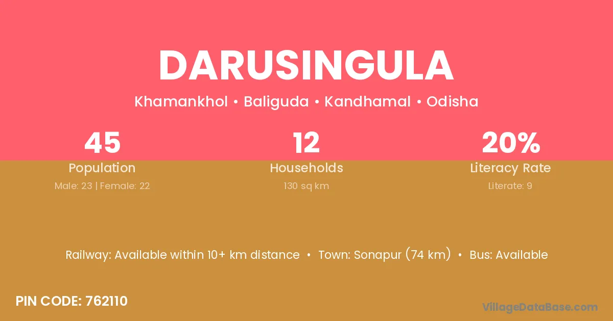 Darusingula village has a total population of 45 people, of which 23 are males and 22 are females.