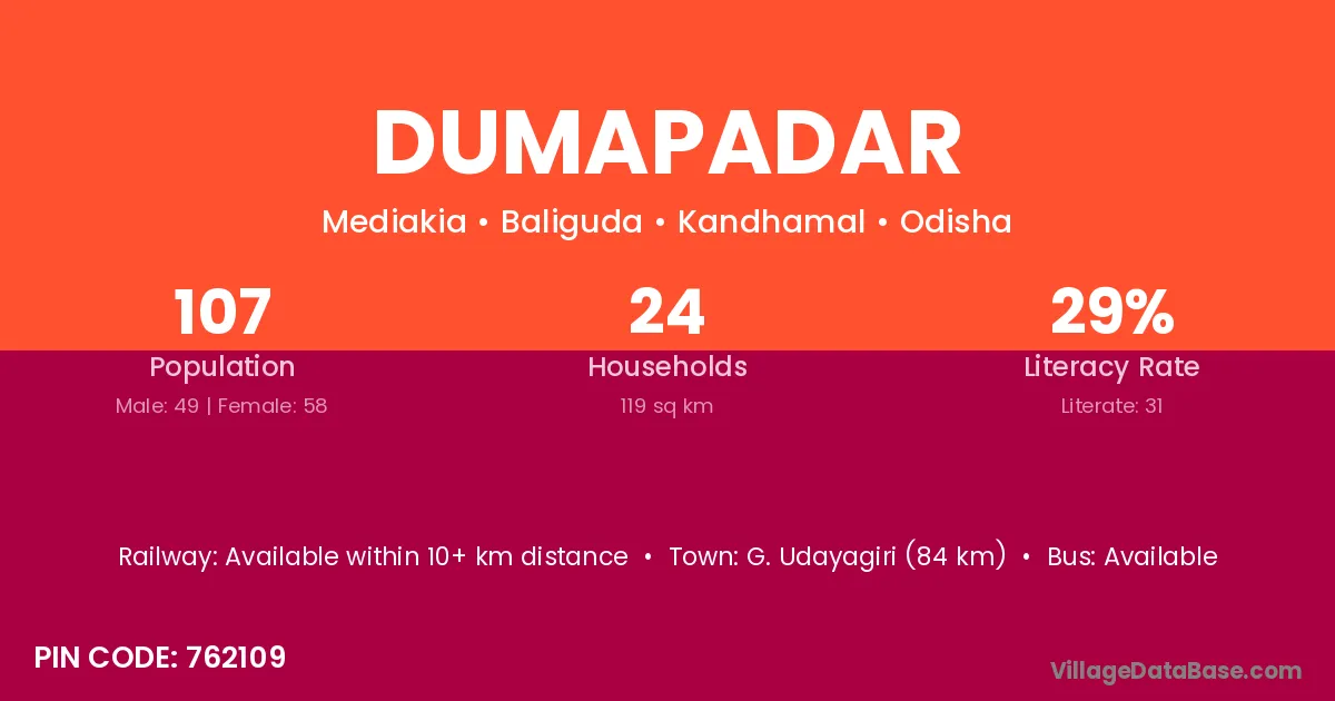 G. Udayagiri (84 km) is the nearest town to Dumapadar village for major economic activities and is located approximately 84 km away.