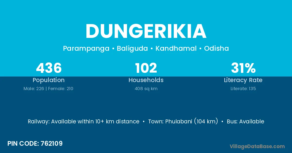 Phulabani (104 km) is the nearest town to Dungerikia village for major economic activities and is located approximately 104 km away.