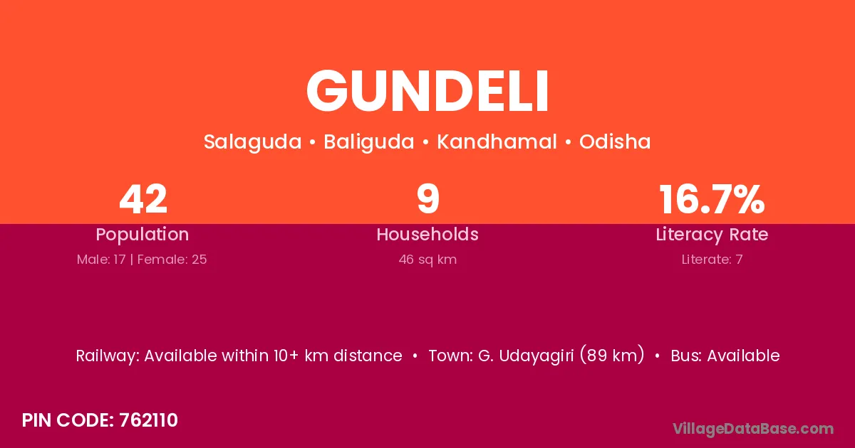 Gundeli village has a total population of 42 people, of which 17 are males and 25 are females.