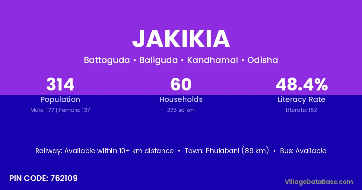 Phulabani (89 km) is the nearest town to Jakikia village for major economic activities and is located approximately 89 km away.
