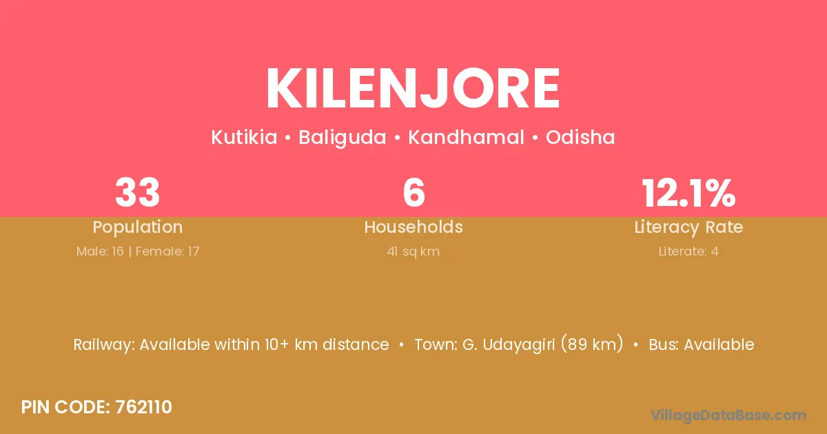 Kilenjore village has a total population of 33 people, of which 16 are males and 17 are females.