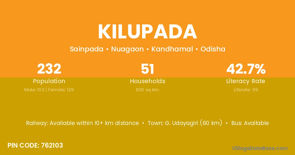G. Udayagiri (78 km) is the nearest town to Kilupada village for major economic activities and is located approximately 78 km away.