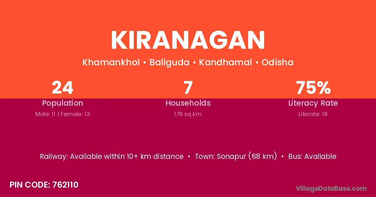 Kiranagan village has a total population of 24 people, of which 11 are males and 13 are females.