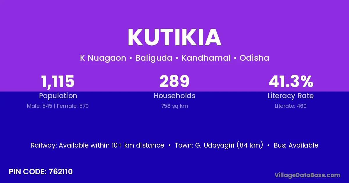 Kutikia village has a total population of 1,115 people, of which 545 are males and 570 are females.