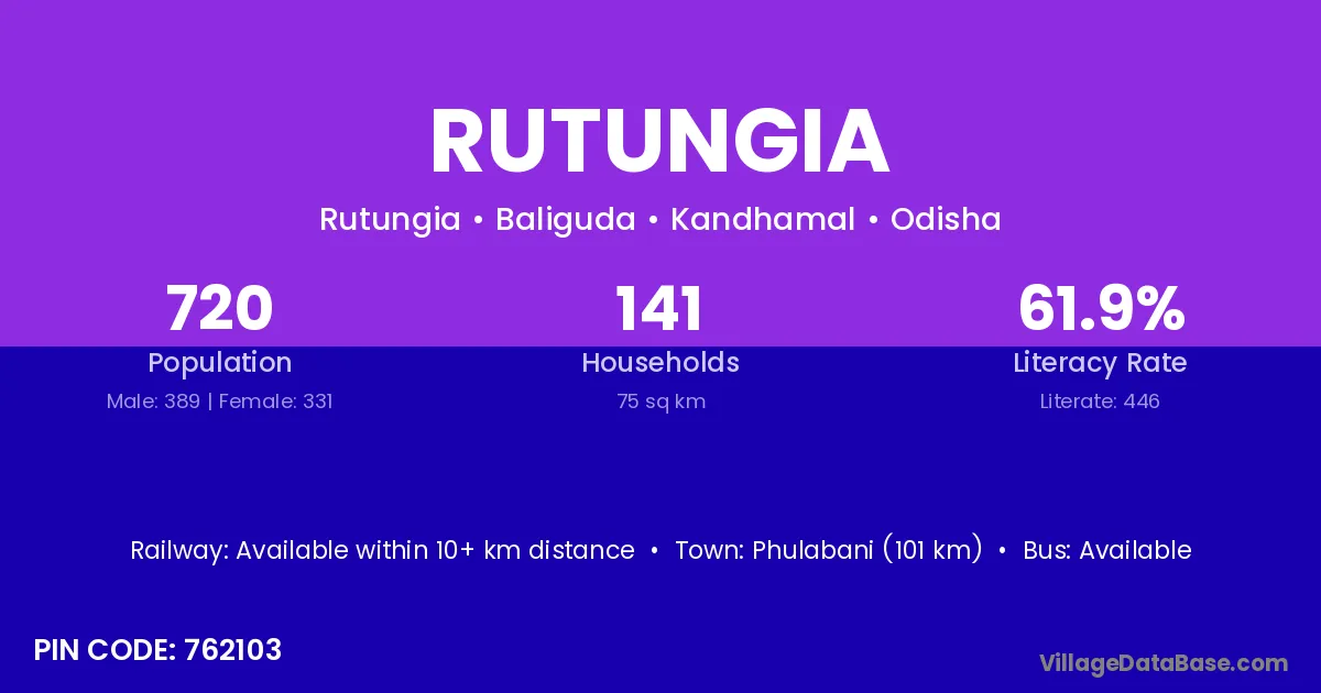 Phulabani (101 km) is the nearest town to Rutungia village for major economic activities and is located approximately 101 km away.