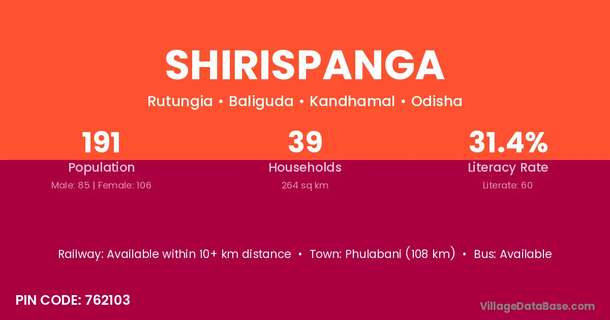 Phulabani (108 km) is the nearest town to Shirispanga village for major economic activities and is located approximately 108 km away.