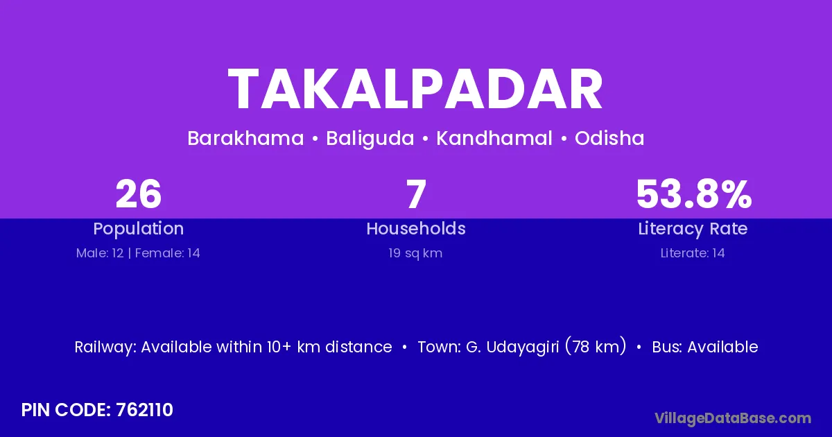 G. Udayagiri (78 km) is the nearest town to Takalpadar village for major economic activities and is located approximately 78 km away.