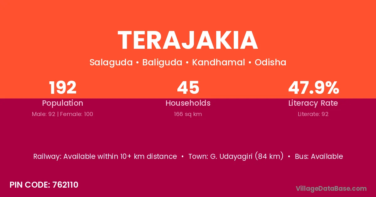 G. Udayagiri (84 km) is the nearest town to Terajakia village for major economic activities and is located approximately 84 km away.