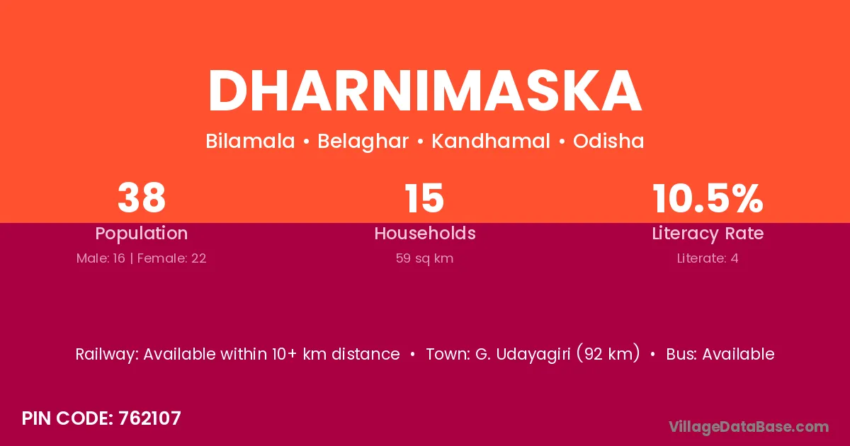 Dharnimaska village has a total population of 38 people, of which 16 are males and 22 are females.