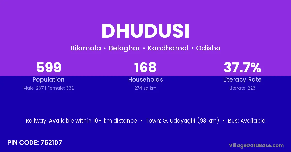 G. Udayagiri (93 km) is the nearest town to Dhudusi village for major economic activities and is located approximately 93 km away.