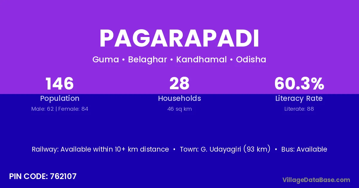 Pagarapadi village has a total population of 146 people, of which 62 are males and 84 are females.