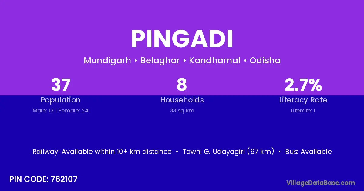 Pingadi village has a total population of 37 people, of which 13 are males and 24 are females.