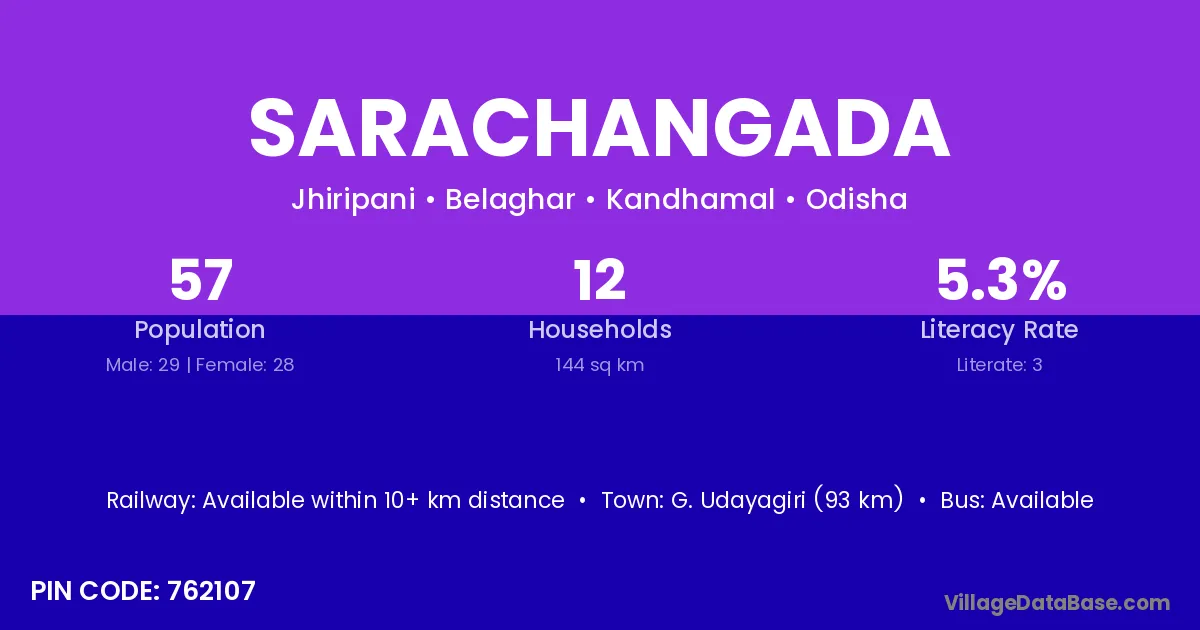 The literacy rate of Sarachangada village is 5.26%. Male literacy stands at 10.34% and female literacy at 0.00%.