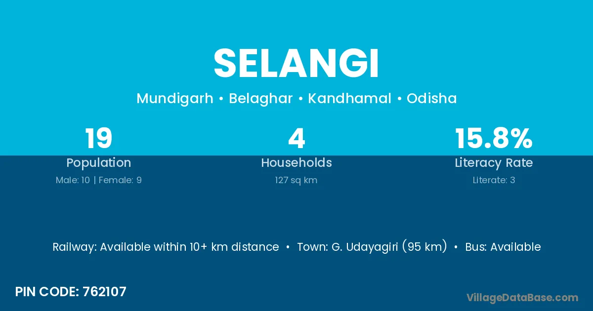 G. Udayagiri (95 km) is the nearest town to Selangi village for major economic activities and is located approximately 95 km away.