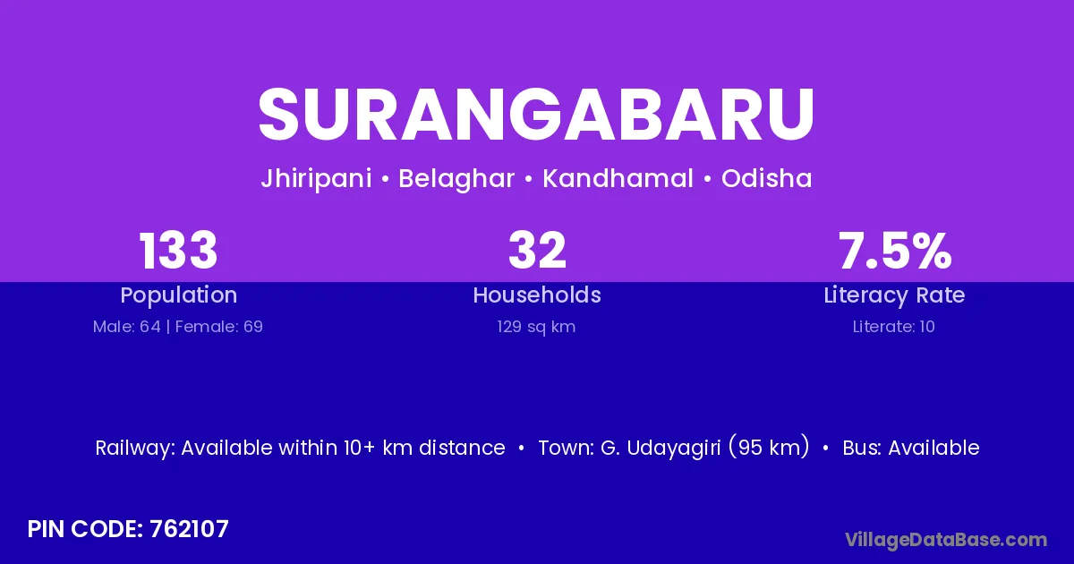 Surangabaru village has a total population of 133 people, of which 64 are males and 69 are females.