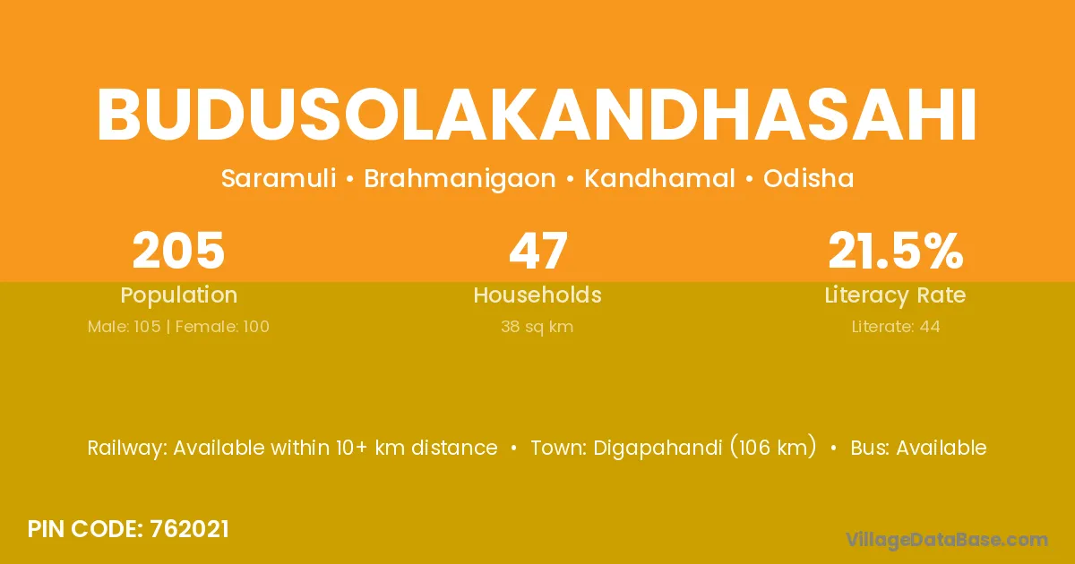Digapahandi (106 km) is the nearest town to Budusolakandhasahi village for major economic activities and is located approximately 106 km away.