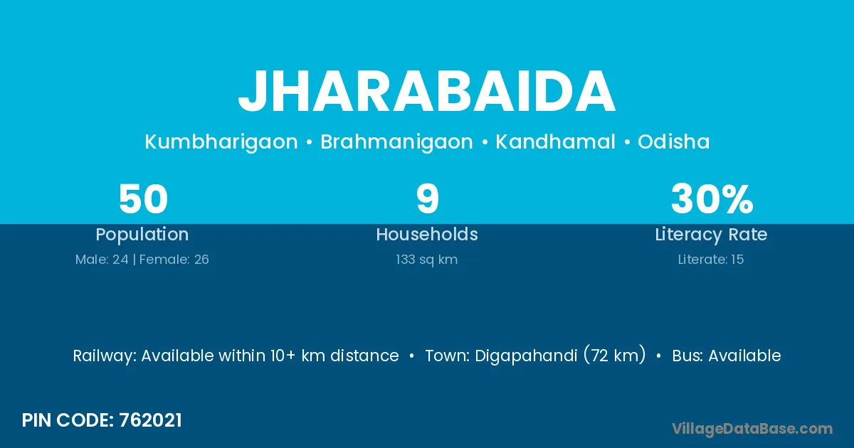 Digapahandi (72 km) is the nearest town to Jharabaida village for major economic activities and is located approximately 72 km away.
