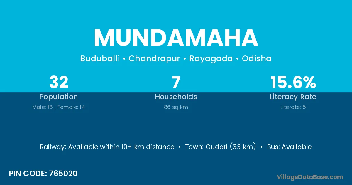 Digapahandi (85 km) is the nearest town to Mundamaha village for major economic activities and is located approximately 85 km away.
