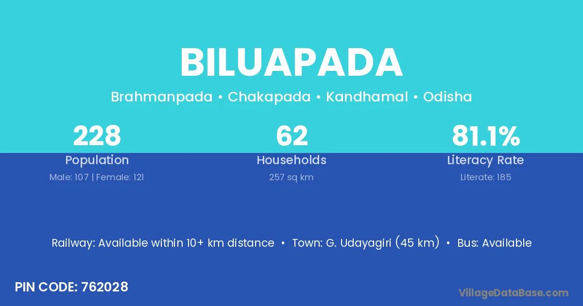 G. Udayagiri (45 km) is the nearest town to Biluapada village for major economic activities and is located approximately 45 km away.