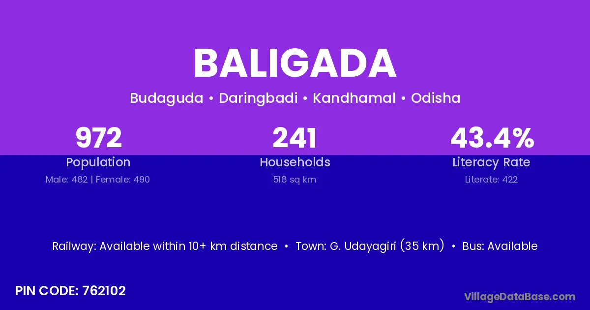 Baligada village has a total population of 972 people, of which 482 are males and 490 are females.
