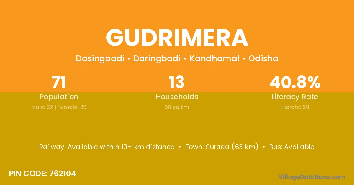 Surada (63 km) is the nearest town to Gudrimera village for major economic activities and is located approximately 63 km away.