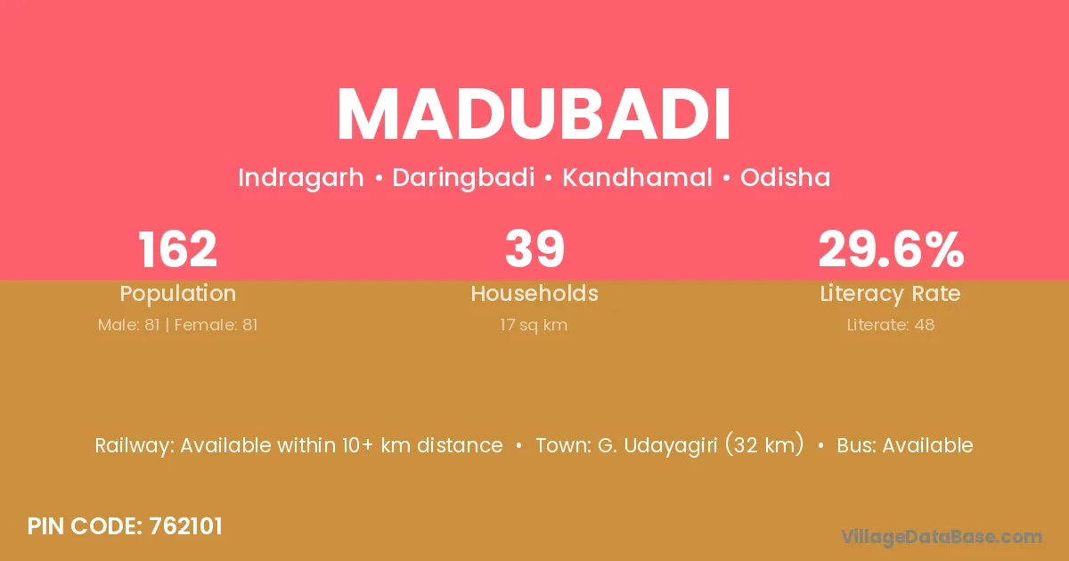 Madubadi village has a total population of 162 people, of which 81 are males and 81 are females.
