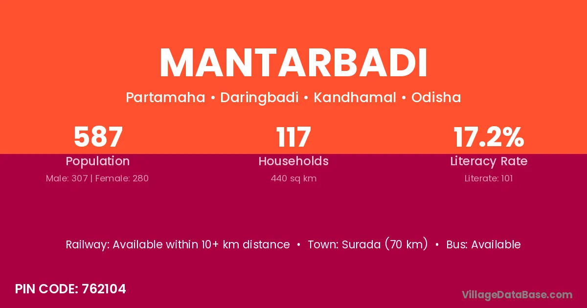 Mantarbadi village has a total population of 587 people, of which 307 are males and 280 are females.