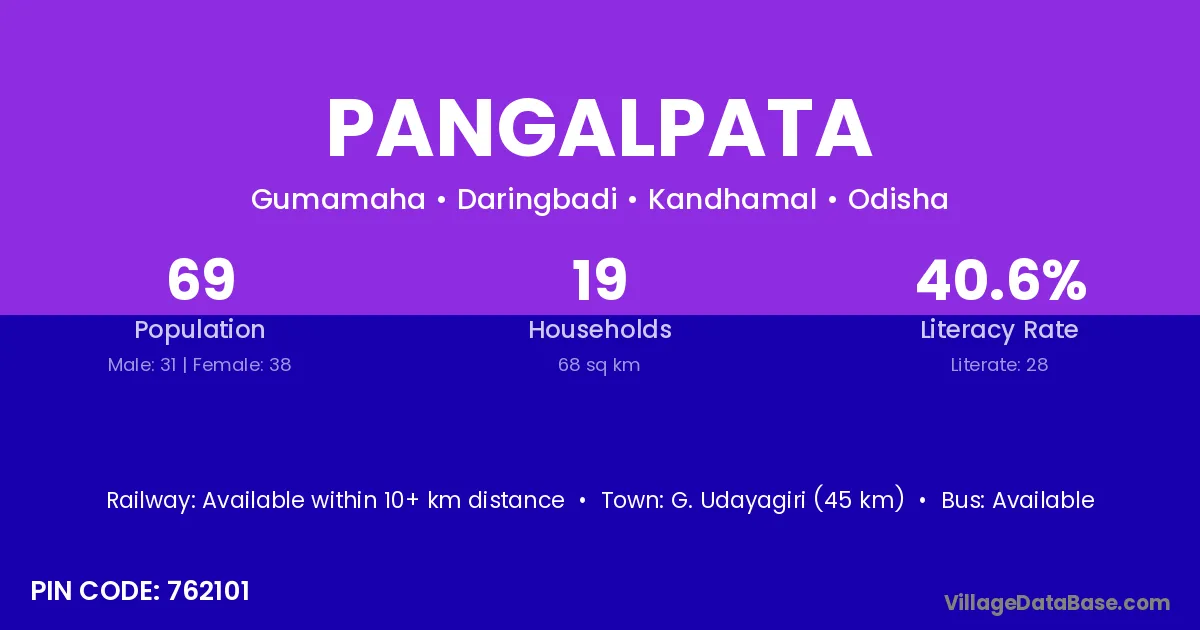 Pangalpata village has a total population of 69 people, of which 31 are males and 38 are females.