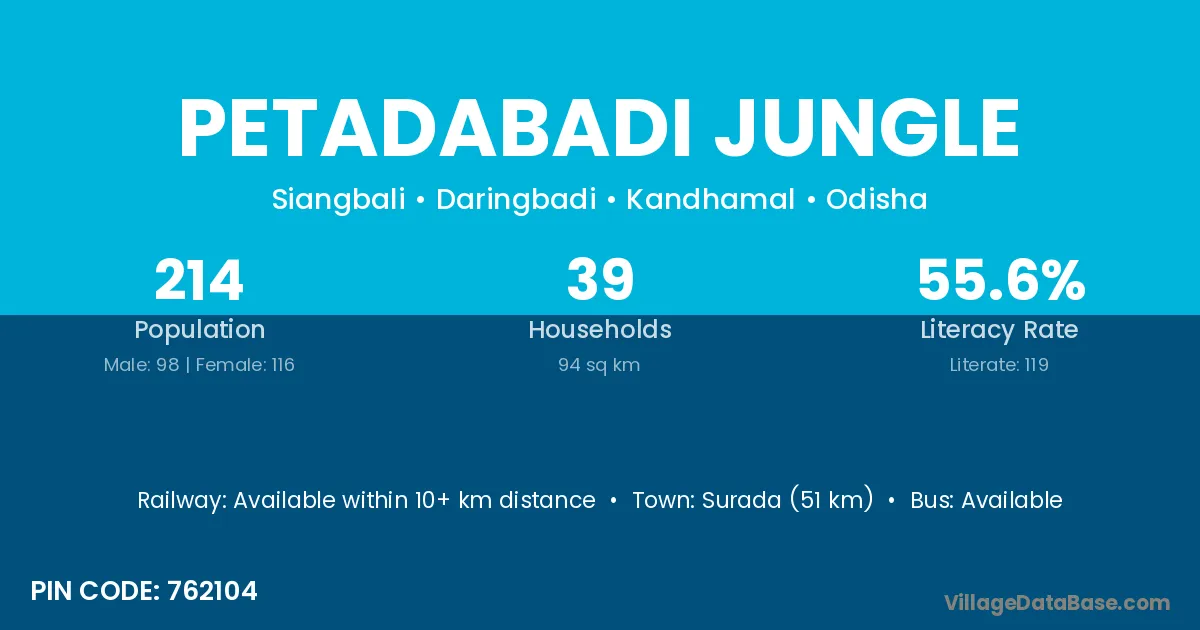 Petadabadi Jungle village has a total population of 214 people, of which 98 are males and 116 are females.