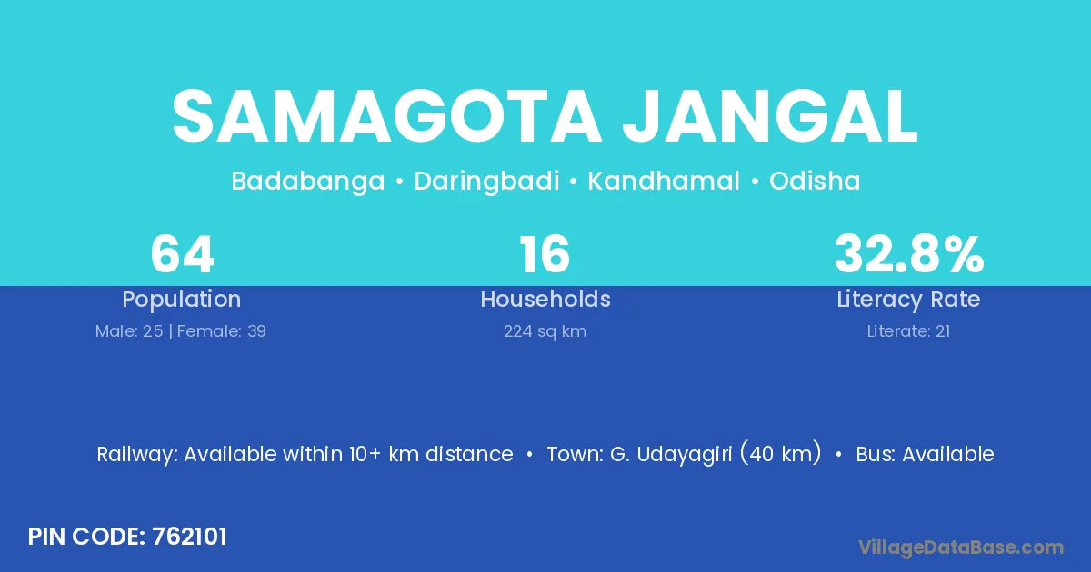G. Udayagiri (40 km) is the nearest town to Samagota Jangal village for major economic activities and is located approximately 40 km away.