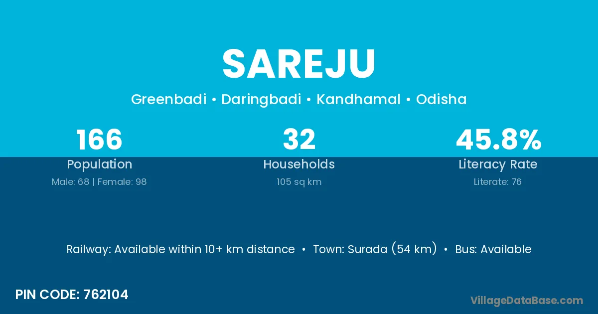 Surada (54 km) is the nearest town to Sareju village for major economic activities and is located approximately 54 km away.