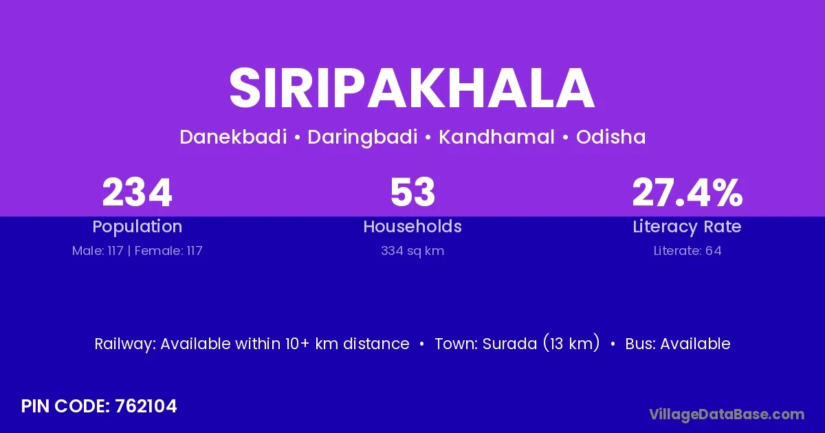 Surada (13 km) is the nearest town to Siripakhala village for major economic activities and is located approximately 13 km away.
