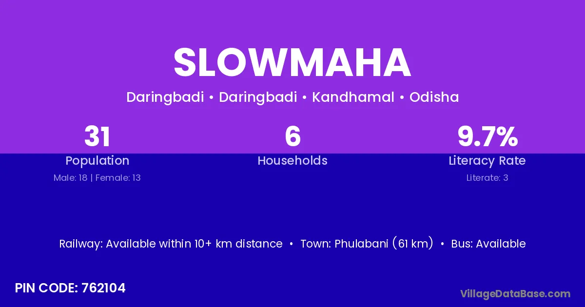 Phulabani (61 km) is the nearest town to Slowmaha village for major economic activities and is located approximately 61 km away.