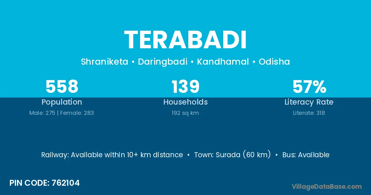 Surada (60 km) is the nearest town to Terabadi village for major economic activities and is located approximately 60 km away.