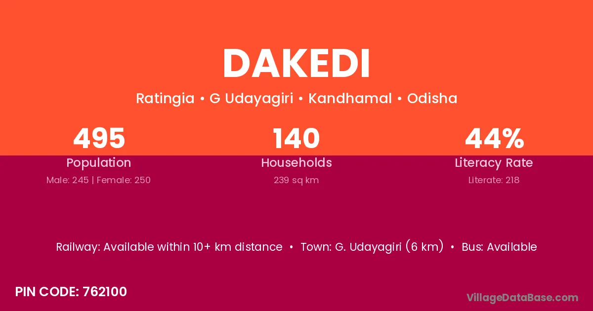 G. Udayagiri (6 km) is the nearest town to Dakedi village for major economic activities and is located approximately 6 km away.