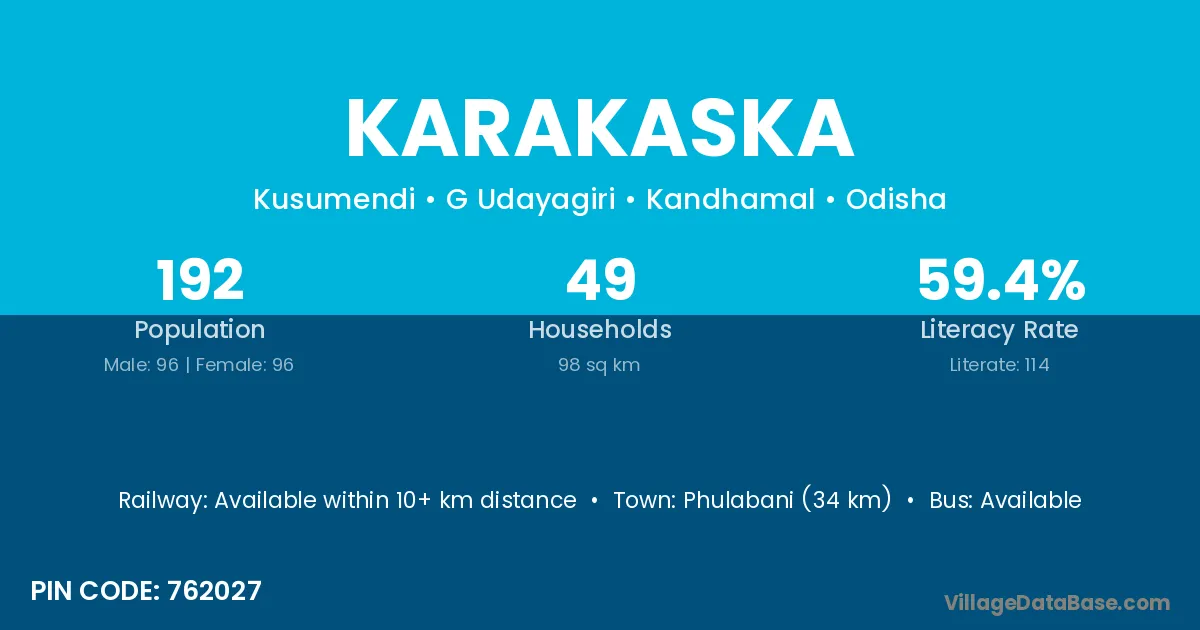 Phulabani (34 km) is the nearest town to Karakaska village for major economic activities and is located approximately 34 km away.