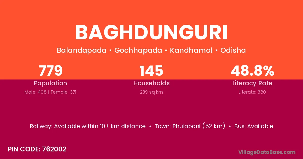 Phulabani (52 km) is the nearest town to Baghdunguri village for major economic activities and is located approximately 52 km away.