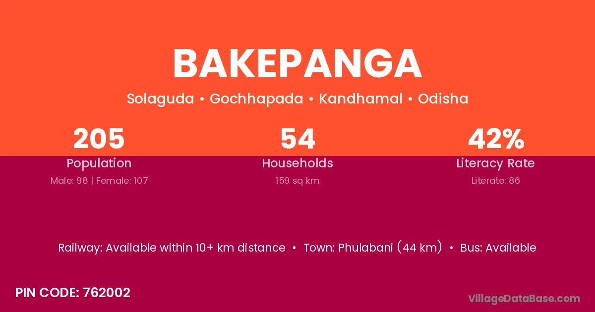 Phulabani (44 km) is the nearest town to Bakepanga village for major economic activities and is located approximately 44 km away.