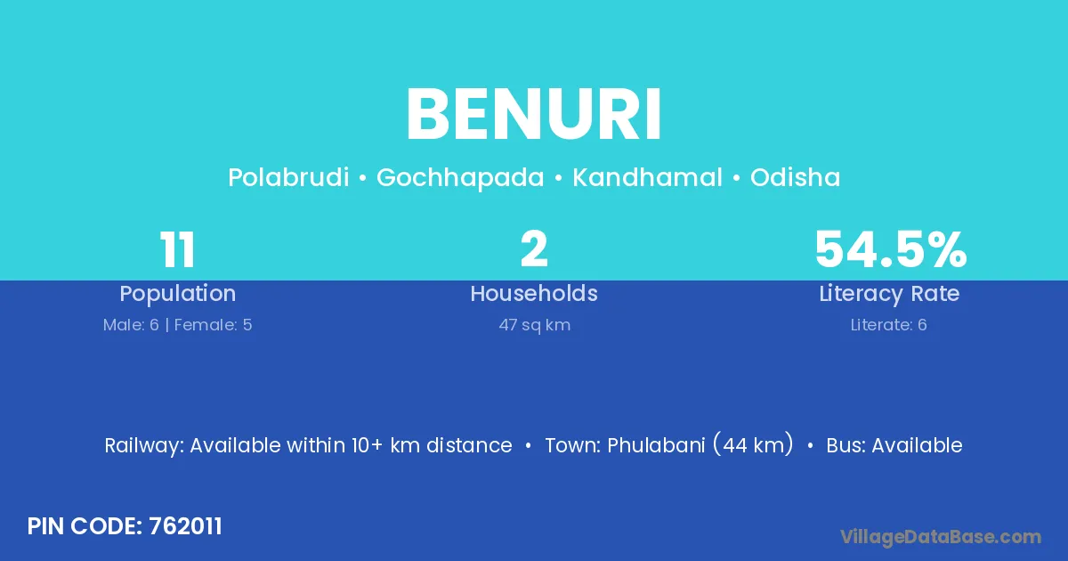 Phulabani (44 km) is the nearest town to Benuri village for major economic activities and is located approximately 44 km away.
