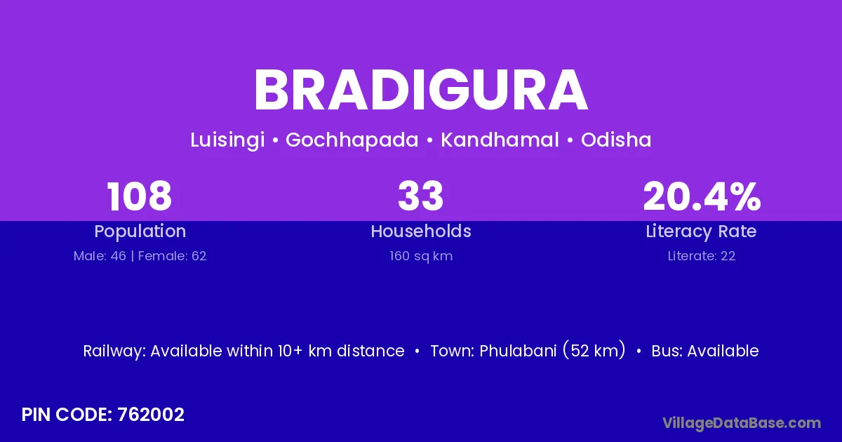 Phulabani (52 km) is the nearest town to Bradigura village for major economic activities and is located approximately 52 km away.