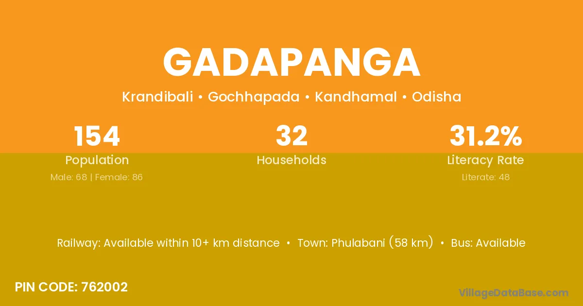 Phulabani (58 km) is the nearest town to Gadapanga village for major economic activities and is located approximately 58 km away.