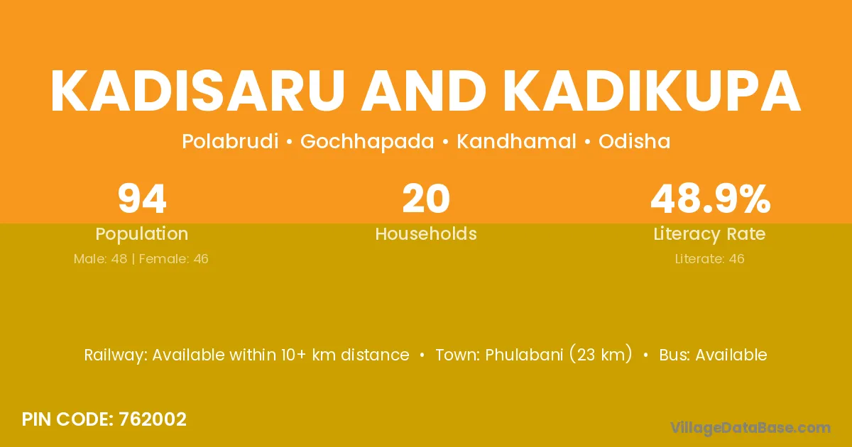 Kadisaru And Kadikupa village has a total population of 94 people, of which 48 are males and 46 are females.