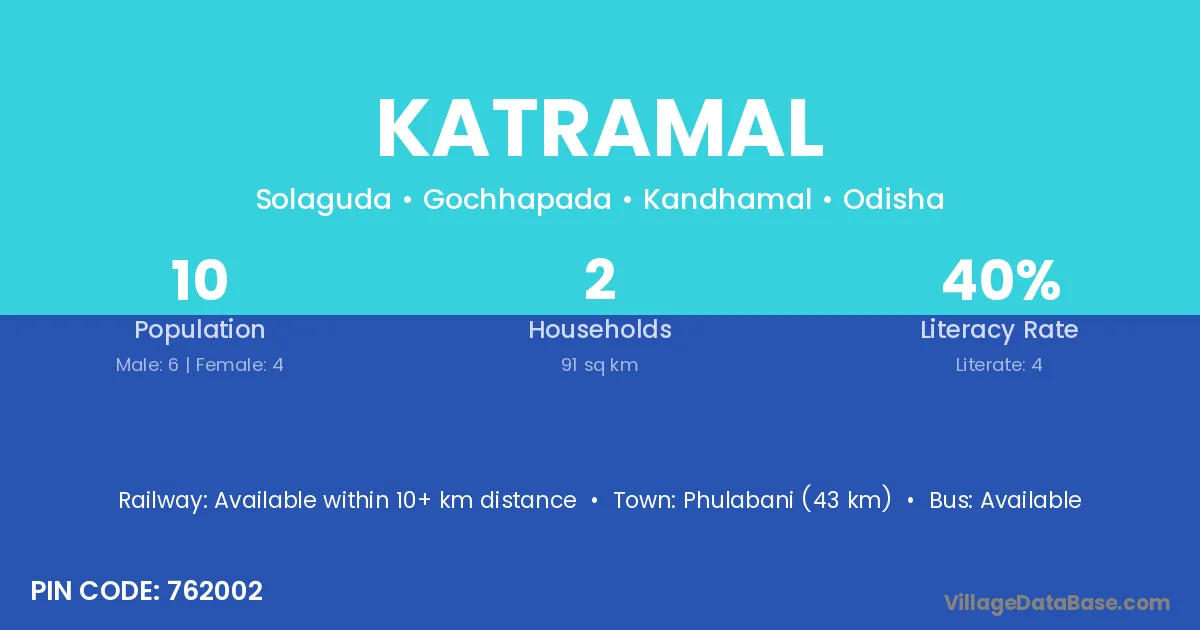 Phulabani (43 km) is the nearest town to Katramal village for major economic activities and is located approximately 43 km away.