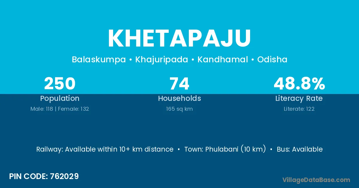 Phulabani (49 km) is the nearest town to Khetapaju village for major economic activities and is located approximately 49 km away.