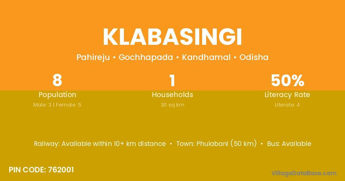 Phulabani (50 km) is the nearest town to Klabasingi village for major economic activities and is located approximately 50 km away.